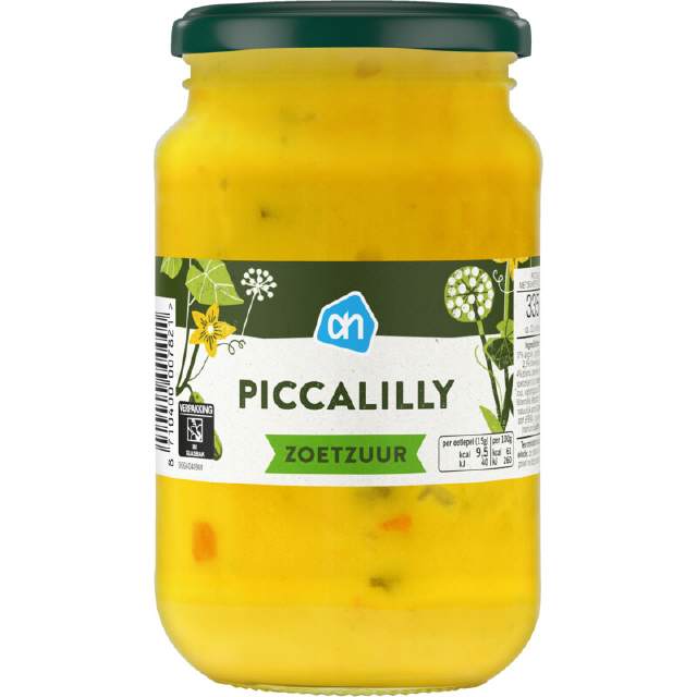 Ingrediënten: water, groente (16% augurk, 4,1% zilverui, 3% wortel, 2,4% bloemkool), suiker, zetmeel (tarwe, maïs), specerijen (o.a. mosterd), azijn, zout, voedingszuur (azijnzuur [E260]), zonnebloemolie, kleurstof (curcumin [E100], riboflavine [E101]), natuurlijk aroma (tarwe), zoetstof (sacharine [E954]), conserveermiddel (natriumdisulfiet [E223]).